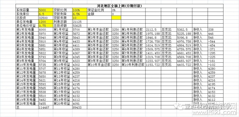 我们列举两种并网方式,首先以河北地区为例,即允许全额上网户用光伏地区,该地区假设未降补贴,(省补0.2元/度,持续三年)地区收益模型如下,所有假定条件如图所示