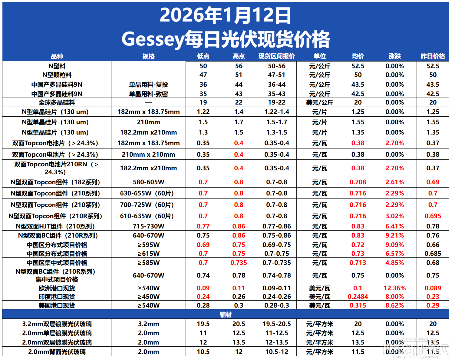 今日组件价格小幅上涨,N型双面Topcon 组件(182系列)价格在0.7-0.8元/ 瓦,均价为0.708元/瓦,上涨2.61%。N型双面Topcon 组件(210系列)价格在0.7-0.8元/ 瓦,均价为0.716元/瓦,上涨2.29%。N型双面Topcon组件(210系列)(700-725W(60片)价格在0.7-0.8元/ 瓦,均价为0.716元/瓦,上涨2.29%。N型双面Topcon组件(210R系列)(610-635W(60片))价格在0.7-0.78元/ 瓦,均价为0.716元/瓦,上涨3.02%。N型双面HJT组件(210系列)价格在0.77-0.86元/ 瓦,均价为0.83元/瓦。N型双面BC组件(210R系列)价格在0.75-0.86元/ 瓦,均价为0.83元/瓦。中国区分布式项目(≥595W)价格在0.69-0.75元/瓦,均价为0.72元/瓦,上涨9.09%,中国区分布式项目(≥615W)价格在0.7-0.75元/瓦,均价为0.73元/瓦,上涨6.57%,中国区集中式项目(≥585W)价格在0.7-0.735元/ 瓦,均价为0.713元/瓦,上涨4.85%。N型双面BC组件(210R系列)集中式项目价格在0.74-0.78元/ 瓦,均价为0.75元/瓦。欧洲港口现货价格在0.09-0.11美元/ 瓦,均价为0.1美元/瓦,上涨12.36%。印度港口现货价格在0.24-0.26美元/ 瓦,均价为0.2484美元/瓦,上涨8.00%。美国港口现货价格在0.28-0.3美元/ 瓦,均价为0.315美元/瓦,上涨8.62%。