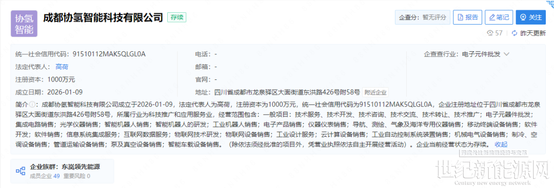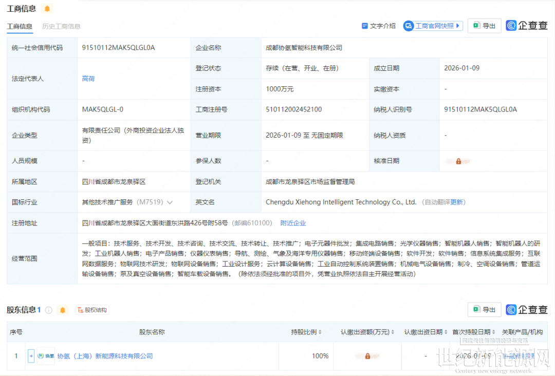 氢能观察从企查查获悉,2026年1月9日,成都协氢智能科技有限公司成立,法定代表人高荷,注册资本1000万。