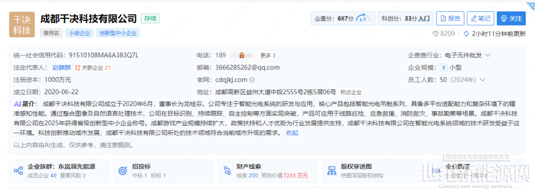 企查查信息显示,成都千决科技有限公司2020年6月,专注于智能光电系统的研发与应用,核心产品包括智能光电吊舱系列,产品可应用于线路巡检、应急救援、消防救灾等场景。