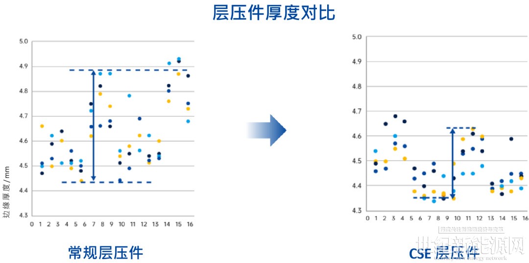 例如,CSE组合结构增强技术,系统性升级了组件结构和材料,有效改善了组件厚度均匀性和边缘密封性,使组件结构更致密、更均匀,抗湿热能力显著提升。经DH3000h测试,DeepBlue 5.0较常规组件功率衰减值降低达2%。